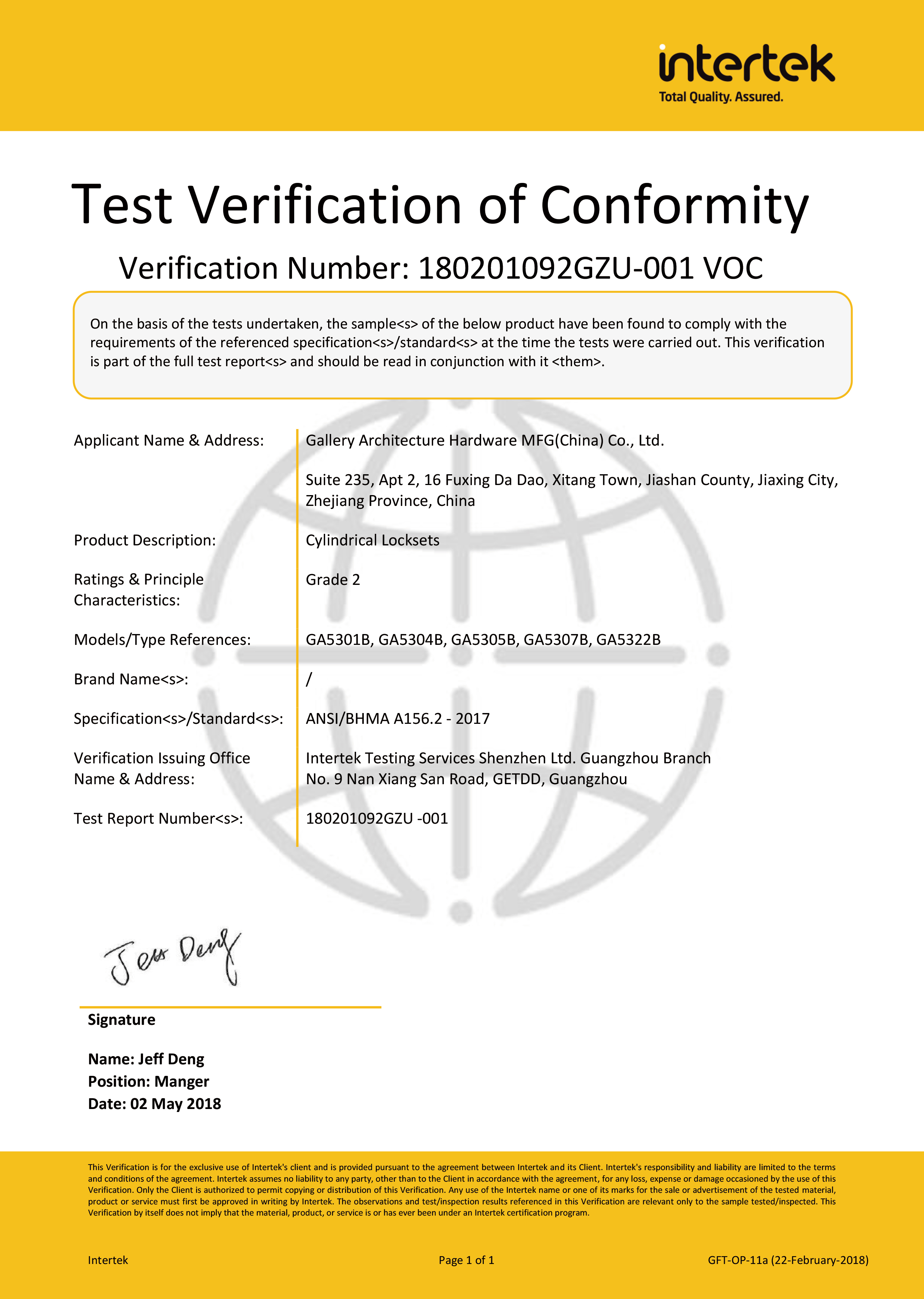 浙江堅迪五金制造有限公司始建于 1995 年。自 2003 開始,公司致力于高標準商業鎖的研發工作,并于 2006 及 2007 年,8700 插芯鎖系列獲得美國國家標準 ANSI A 156.13-2005 一級、ANSI A 156.2-2003 二級和美國 UL 10C3 小時防火測試認證。自 1998 年以來,公司不斷提升產品和客戶服務品質,并獲得了 ISO 9001 的認證。